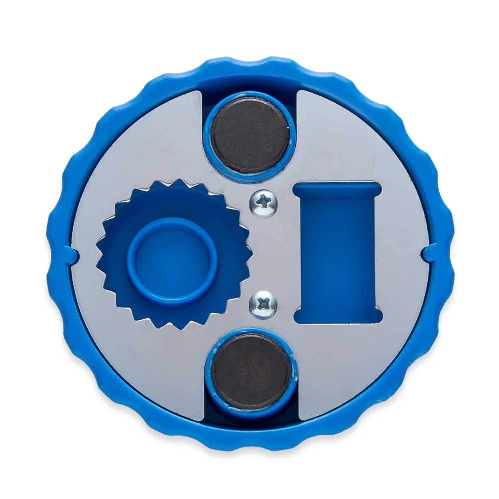 Descrição: Abridor de garrafas em metal com formatos diferentes para a abertura de tampas. Contém um par de imãs para fixação em superfícies metálicas.
