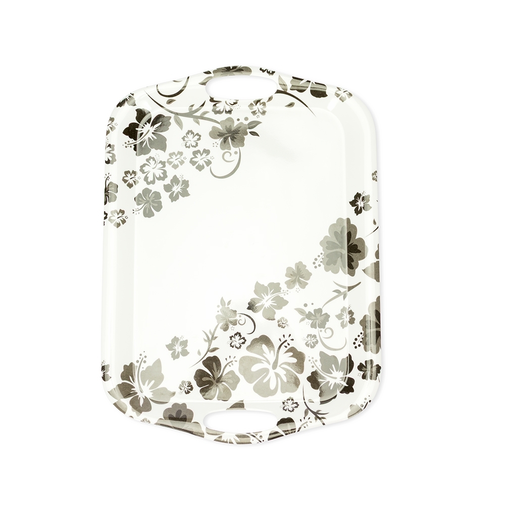 Descrição: Bandeja retangular em melamina, material leve, resistente e fácil de limpar. Possui alças laterais que facilitam o manuseio.