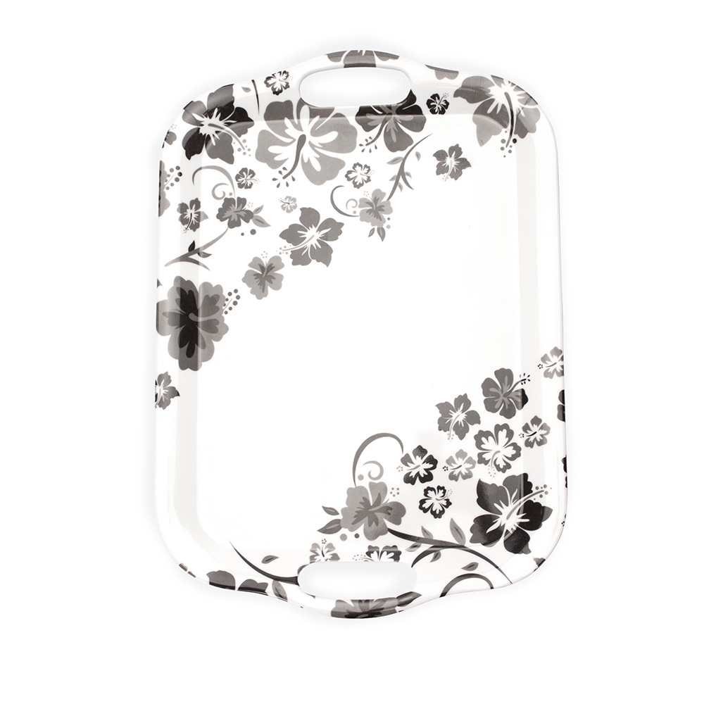 Descrição: Bandeja retangular em melamina, material leve, resistente a impactos e fácil de limpar. Contém duas alças laterais para transporte.