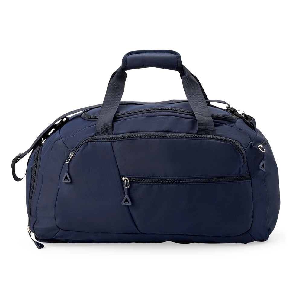 Descrição: Bolsa esportiva em Oxford resistente à água, fechamento em zíper e capacidade máxima de 42 litros. Possui cinco compartimentos principais, incluindo um bolso lateral próprio para guardar tênis. Pode ser transportada de três formas: com alças de mão unidas por suporte em velcro, com alça transversal removível ou na vertical, ao utilizar as alças para as costas guardadas no compartimento inferior.