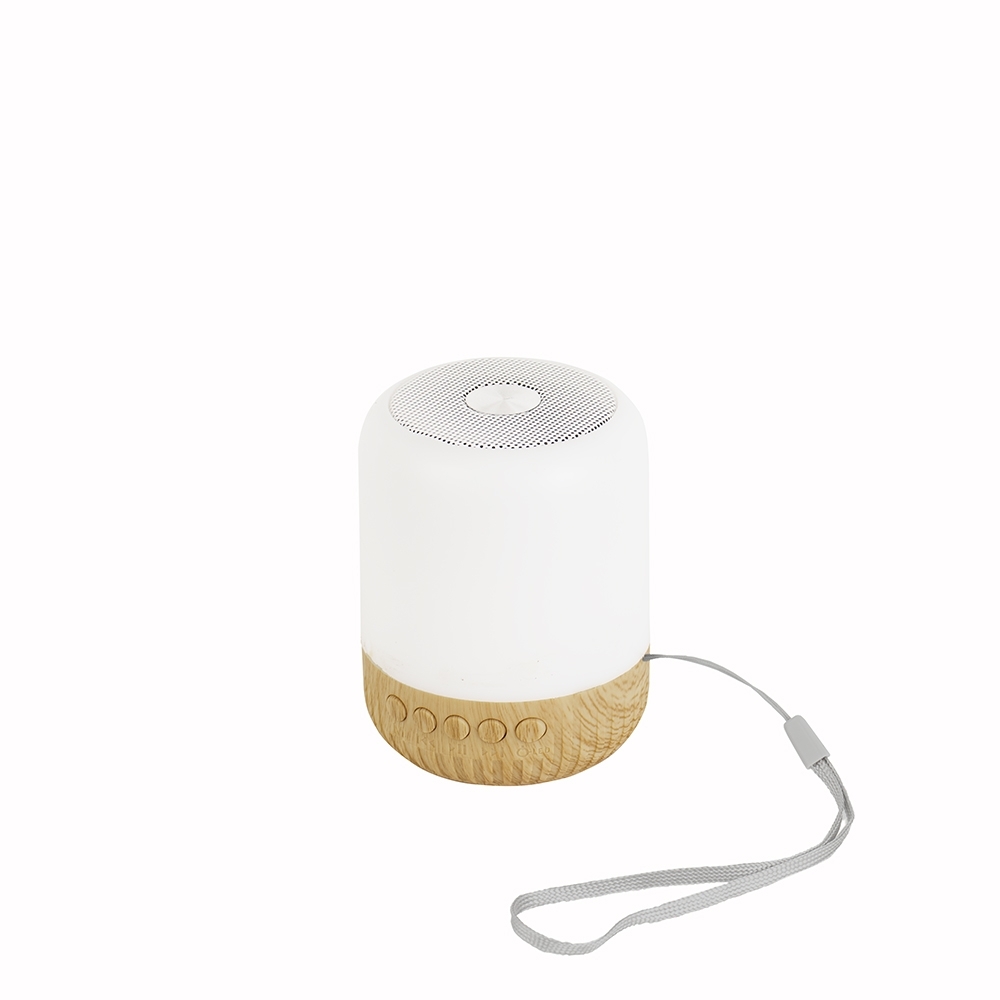 Descrição: Caixa de som multimídia sem fio em plástico com detalhes que remetem à textura de madeira e um anel antiderrapante colado à base. Conta com iluminação em LED e painel de botões para alternância entre os modos Bluetooth, rádio FM e reprodução de arquivos MP3 a partir das entradas para cartão TF (microSD) e USB para pen drives. Acompanha cabo USB-C para carregamento.