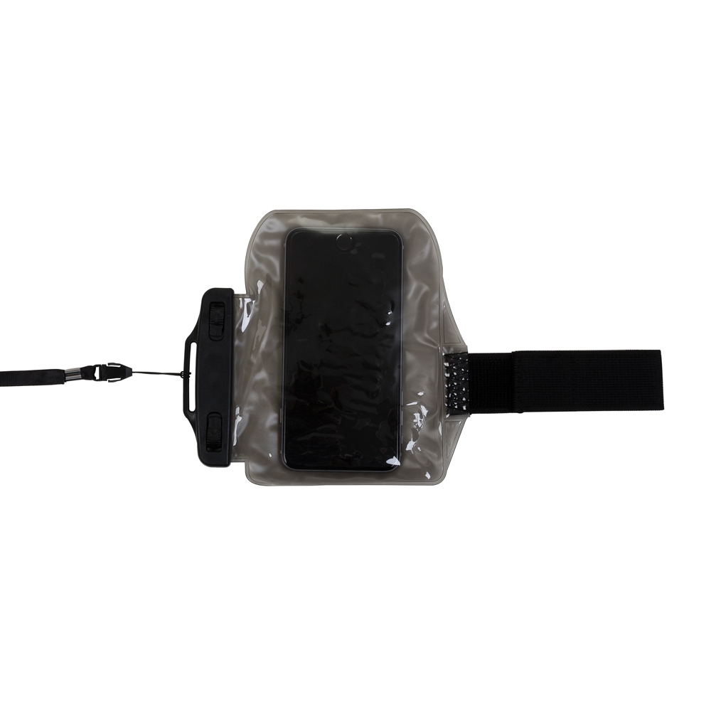 Descrição: Capa braçadeira impermeável para celular. Parte frontal transparente e verso fosco, suporte plástico superior com fivelas rotatórias(basta rotacioná-las para abrir o case). Possui na lateral fita elástica com velcro para e acompanha cordão de cetim.