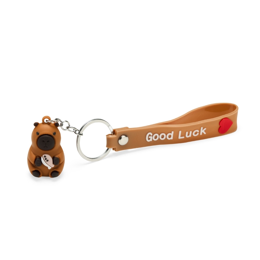 Descrição: Chaveiro com textura emborrachada e em formato de capivara, acompanhado de argola metálica e correia plástica flexível.