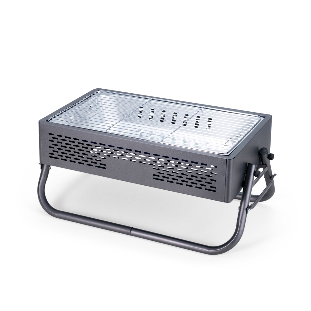 Descrição: Churrasqueira em ferro com aberturas para ventilação e pés montáveis, que também podem ser utilizados como alças para transporte quando a churrasqueira não estiver em uso. Conta ainda com grelha em metal galvanizado e bandeja metálica com alças removíveis para acomodação do carvão.