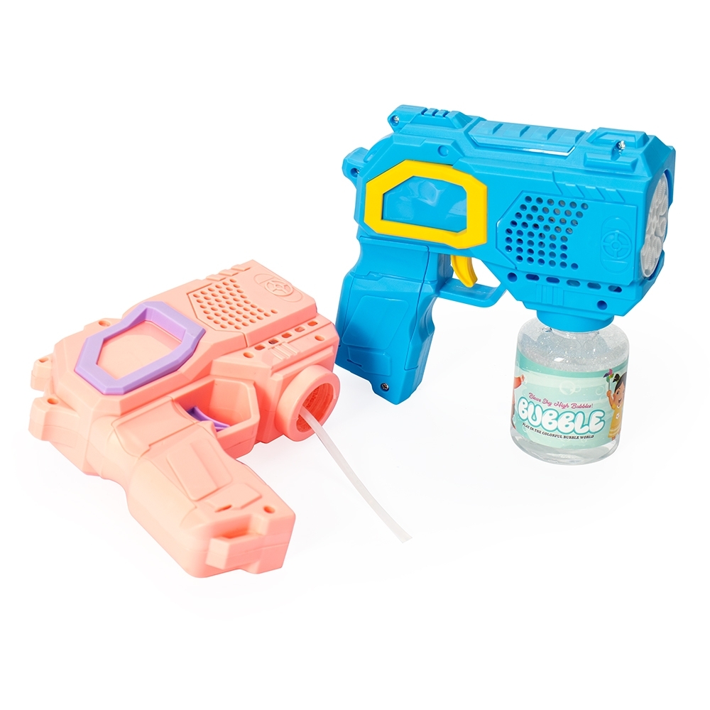 Descrição: Brinquedo lançador de bolhas de sabão feito em plástico. Ao acionar o gatilho, dispara múltiplas bolhas de uma só vez. Funciona com quatro pilhas AA (não inclusas) e acompanha frasco com líquido para formar bolhas e adesivos para decoração.