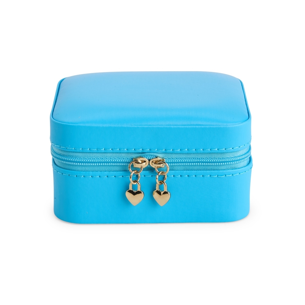 Descrição: Porta-joias em couro sintético de textura lisa com revestimento interno aveludado e fechamento em zíper com puxadores no formado de coração. Possui compartimento principal com divisória almofadada para anéis e brincos, além de dois ganchos e um bolso com elástico no interior da tampa, além de um espelho retangular na parte central do estojo.