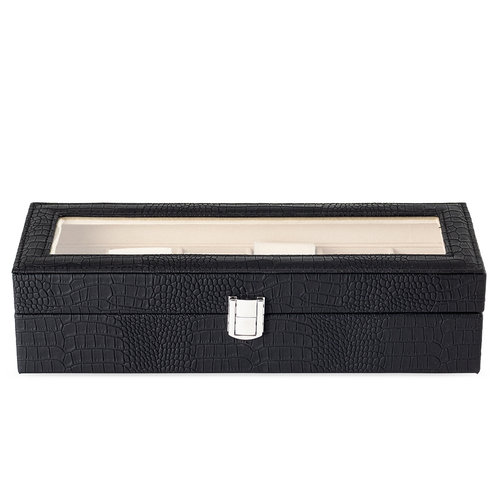 Descrição: Porta-relógios com acabamento texturizado em couro sintético à base de PVC e revestimento interno em veludo. Conta com seis divisórias com almofadas removíveis, visor em vidro e trava de segurança na tampa.